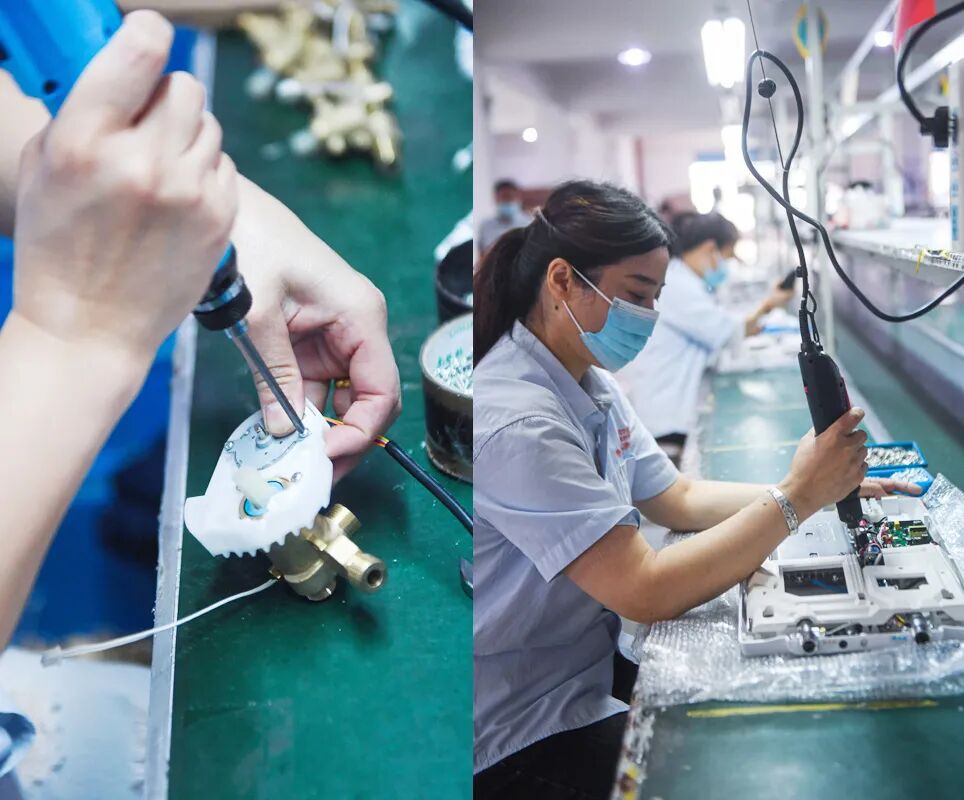 工人在生產(chǎn)線上組裝新款速熱電熱水器